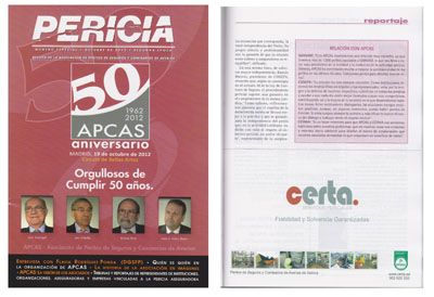 Con motivo de una ocasión tan especial como es este 50 Aniversario, el Grupo Certa ha tenido una destacada presencia en la reconocida revista Pericia, y ha estado representada en todos los actos celebrados a través de su gerente, David Cueto Fernández (miembro también de la Junta Directiva de la O.T. de APCAS en Pontevedra)